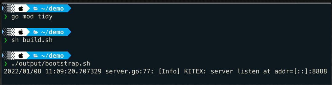 build.sh 构建,就可以启动服务了。Kitex 默认的接听端口是 8888。
