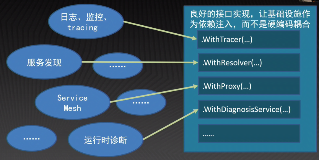 它不可能拥有字节跳动内部的所有基础设施。那么企业在使用的时候肯定需要定制化,他可能需要定义自己的注册中心、负载均衡、连接池等等。如果业务方要使用这些功能的话,就需要加入非常非常多的参数。而