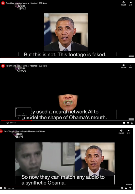 上图中展示了华盛顿大学的研究人员制作的一份关于贝拉克·侯赛因·奥巴马的深度研究报告。报告中,研究人员借助人工智能技术,通过第三者并模仿美国前总统奥巴马的一段演讲视频中的面部动作,成功伪造出一段冒牌奥巴马演讲的视频。