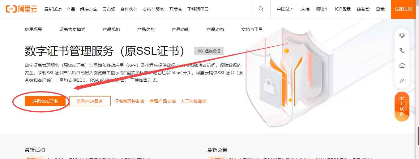 1、打开阿里云SSL证书页面,点击“选购SSL证书”,如下图: