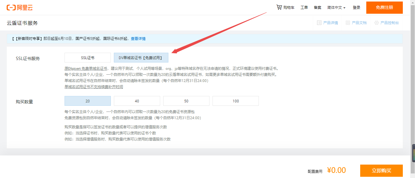 可以看到配置费用为0元,然后点“立即购买”,勾选协议,支付0元。支付成功后,即购买了免费SSL证书资源包,这个资源包可以申请20个免费SSL证书,后续需要在SSL管理控制台申请使用。