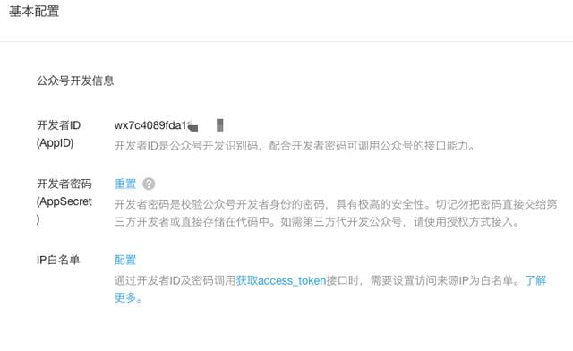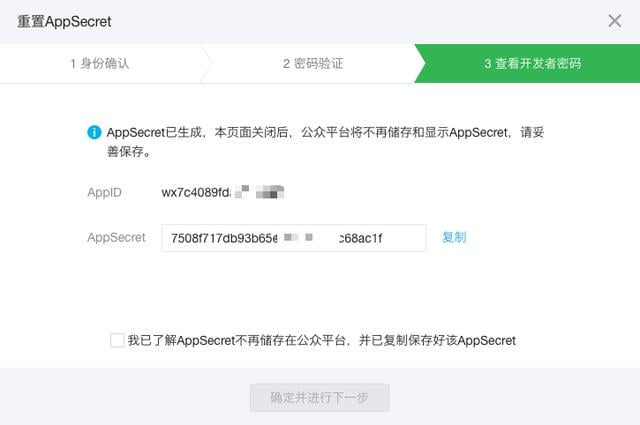 2、公众帐号Secret——登录公众平台申请重置之后查看AppSecret