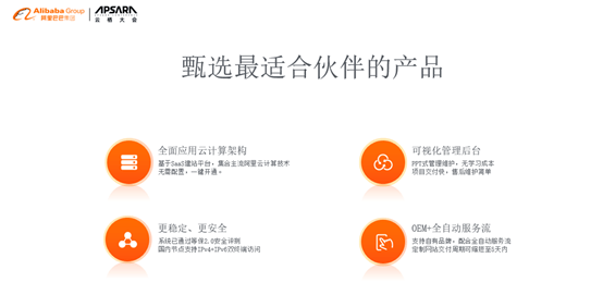 我们为分销伙伴甄选最适合的产品,阿里云心选建站基于SaaS建站平台,集合主流阿里云计算技术,无需配置,一键开通;心选建站有可视化后台管理的特点,对于客户来说,PPT式的管理维护,无学习成本,对于伙伴来说,项目交付快,售后维护简单;并且我们的系统已经通过等保2.0安全评测,国内节点支持IPv4+IPv6双终端访问,更稳定、更安全;同时还支持自有品牌,配合全自动服务流,定制网站交付周期可缩短至5天内。