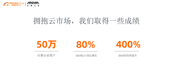 拥抱云市场,我们取得了一些成绩,目前云梦的付费企业已经超过50万家,2019收入同比增长80%,客均单提升400%。