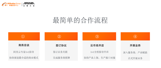 伙伴的合作流程也很简单,就四步:商务洽谈——签订协议——云市场开店——开展业务。