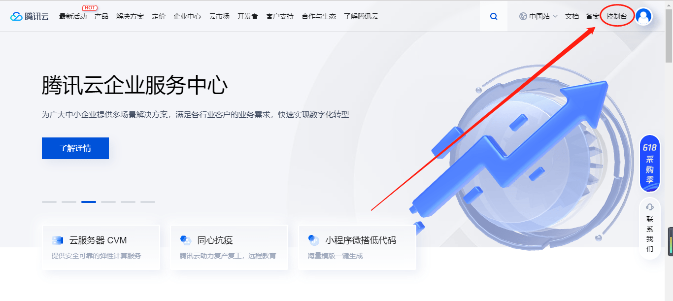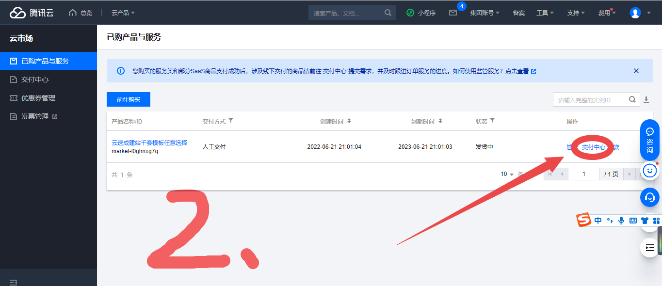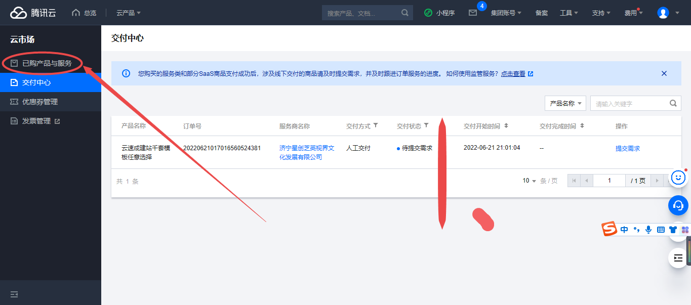 腾讯云市场业务操作步骤购买我们的产品服务后直接点击管理进入云市场管理界面一、点击已购买产品二、点击交付中心三、点击提交需求如已退出界面,进入腾讯云主页。点击右上角控制台!点击控制台后选择最近访问的云市场即可! 赏
